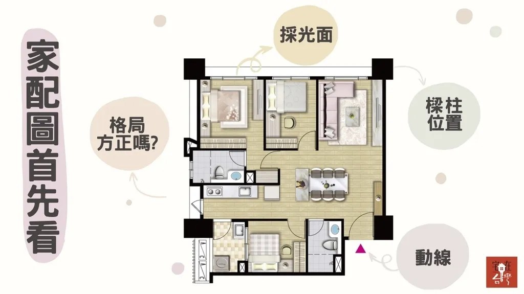 我知道很多人看房子喜歡實地走訪,感覺看得到也摸得著,可以實際感受真實空間感,那還沒蓋好的預售屋,該怎麼讓賞屋者了解格局配置呢?這時候銷售人員會拿出一張裡頭畫了傢俱的圖面,俗稱「家配圖」,讓你用上帝的視角看出空間格局、動線及傢俱擺放配置,對未來住進去容易充滿想像~