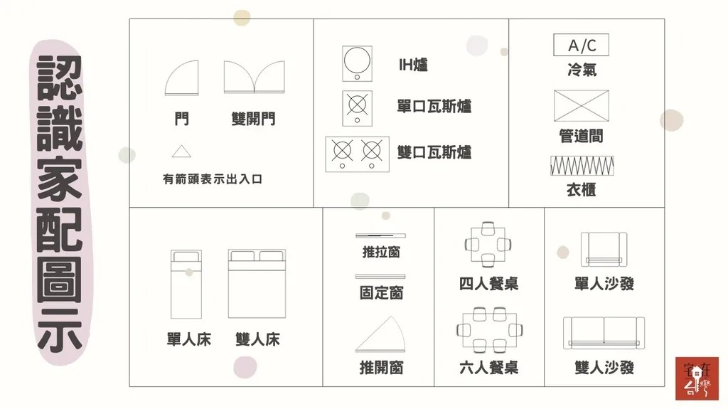 其實家配圖裡畫得讓人很容易明白,只有少部分要特別留意,像是窗戶開窗方式、空調、管道間位置等,相關畫法可以看以下圖示會更清楚。