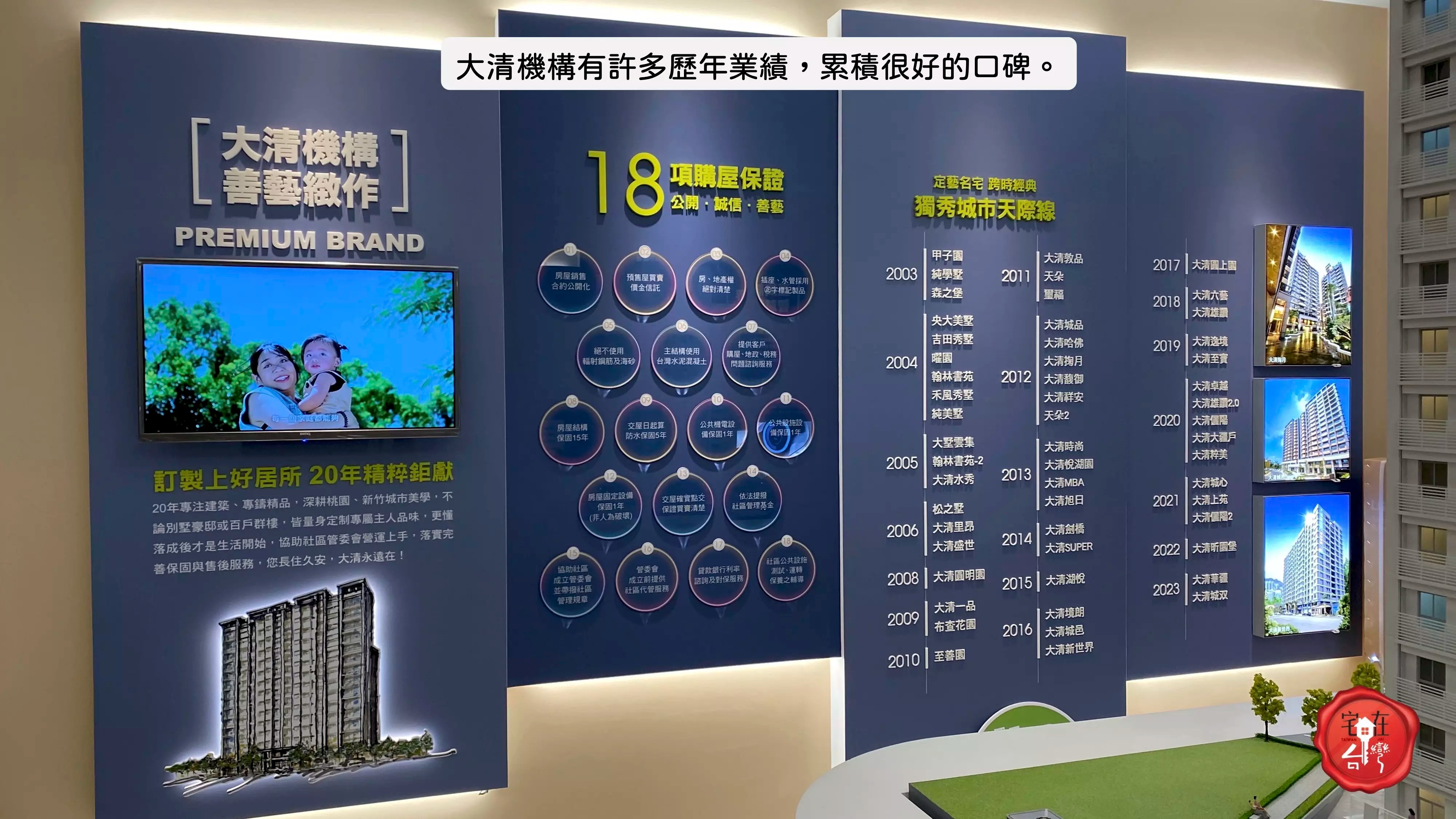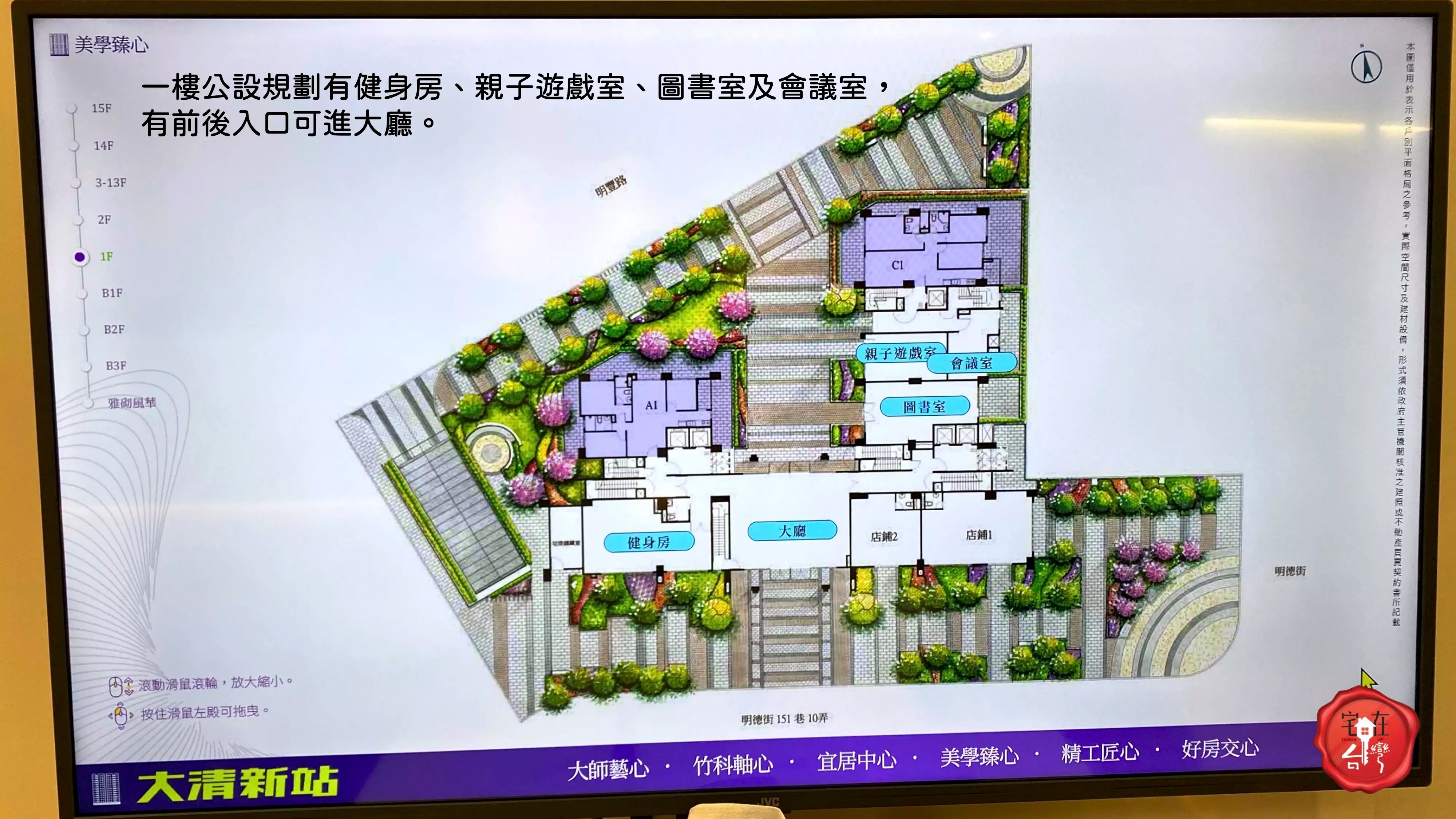 「大清新站」周邊建築高度有限,保證了高樓層住戶的視野無遮蔽。社區內的公共設施也非常齊全,交誼廳、圖書室、兒童遊戲室、會議室、健身房等應有盡有,簡單而實用的設計,在家下樓就能享受豐富的設備,不用花時間舟車勞頓跑太遠,而且社區前後都有路,回家進大廳不用繞路而行很方便。 接待中心的銷售螢幕可以直接試算售價金額的還款時程,評估起來非常方便。